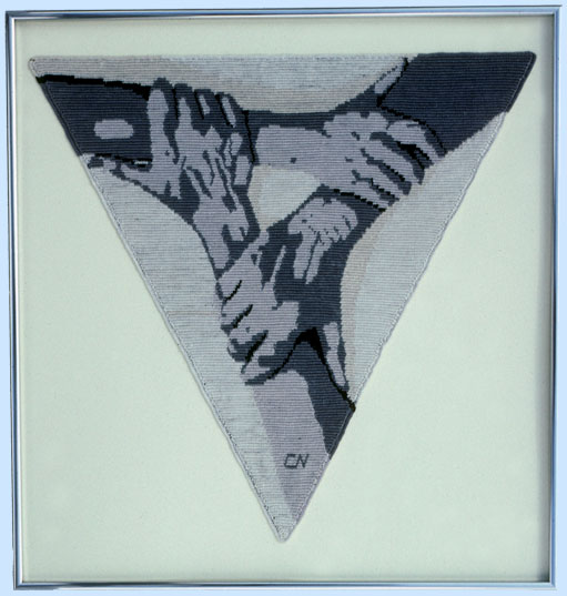 This family portrait truly reflected the precarious state of my colorless second marriage. I tried to balance the family and support my daughter as she clung to her step-father while he had his grip on me. The image on the right was projected onto flat tapestry crochet graph paper, then traced. It was tapestry crocheted with a size 5 steel crochet hook and 5 shades of gray linen. |