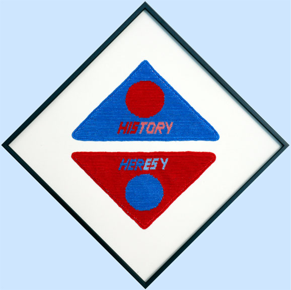 | This tapestry is based on my observation that history, for the most part, has been written by men from their point of view. What women say is often labeled as heretical. The same situation is often perceived very differently from a man's or a woman's point of view. This is the second of 2 pieces that explore the same topic. |