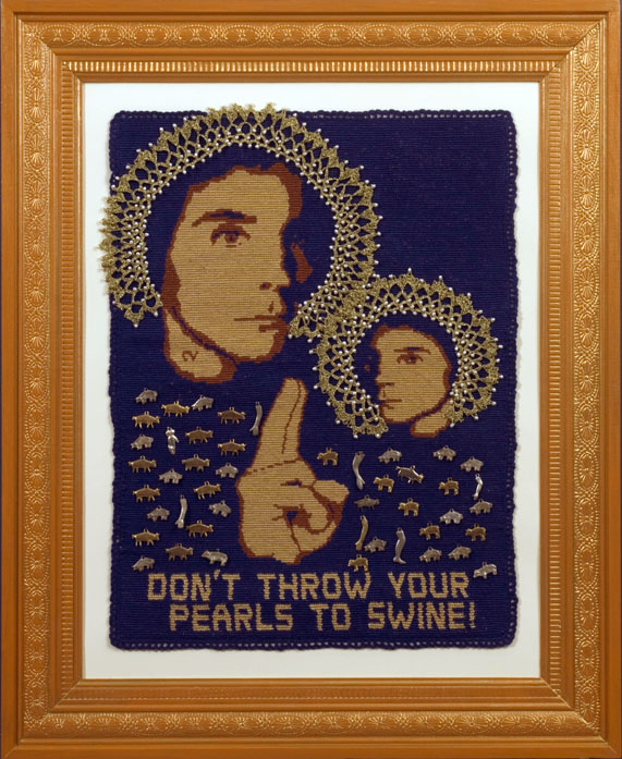 Mother's Advice Series 23 1/2" x 28 1/2" framed size, tapestry crochet, linen, metallic thread, pearls, and metal milagros, 2001-2006 |